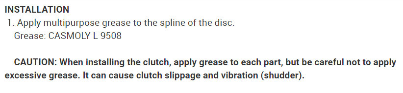 CAUTION: When installing the clutch, apply grease to each part, but be careful not to apply excessive grease. It can cause clutch slippage and vibration (shudder).