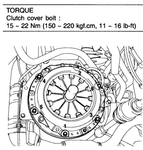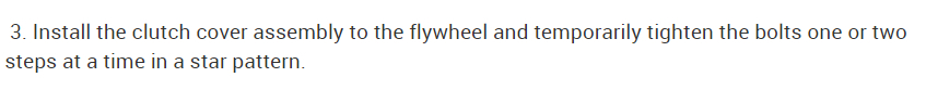 3. Install the clutch cover assembly to the flywheel and temporarily tighten the bolts one or two steps at a time in a star pattern.