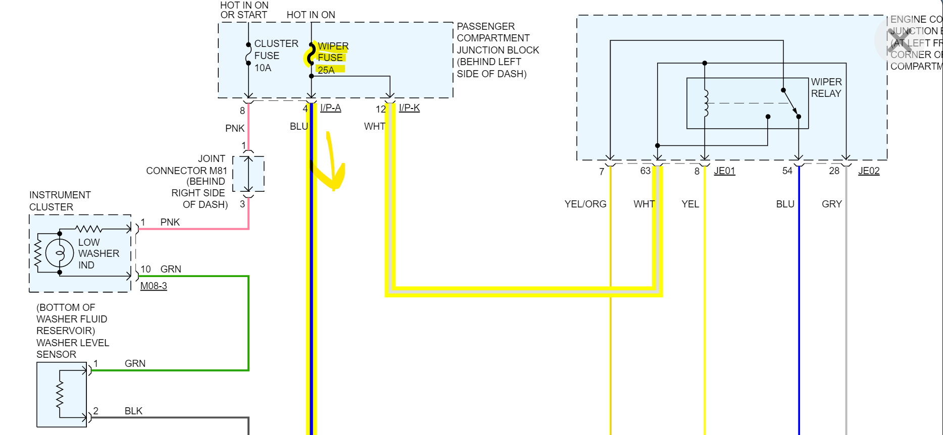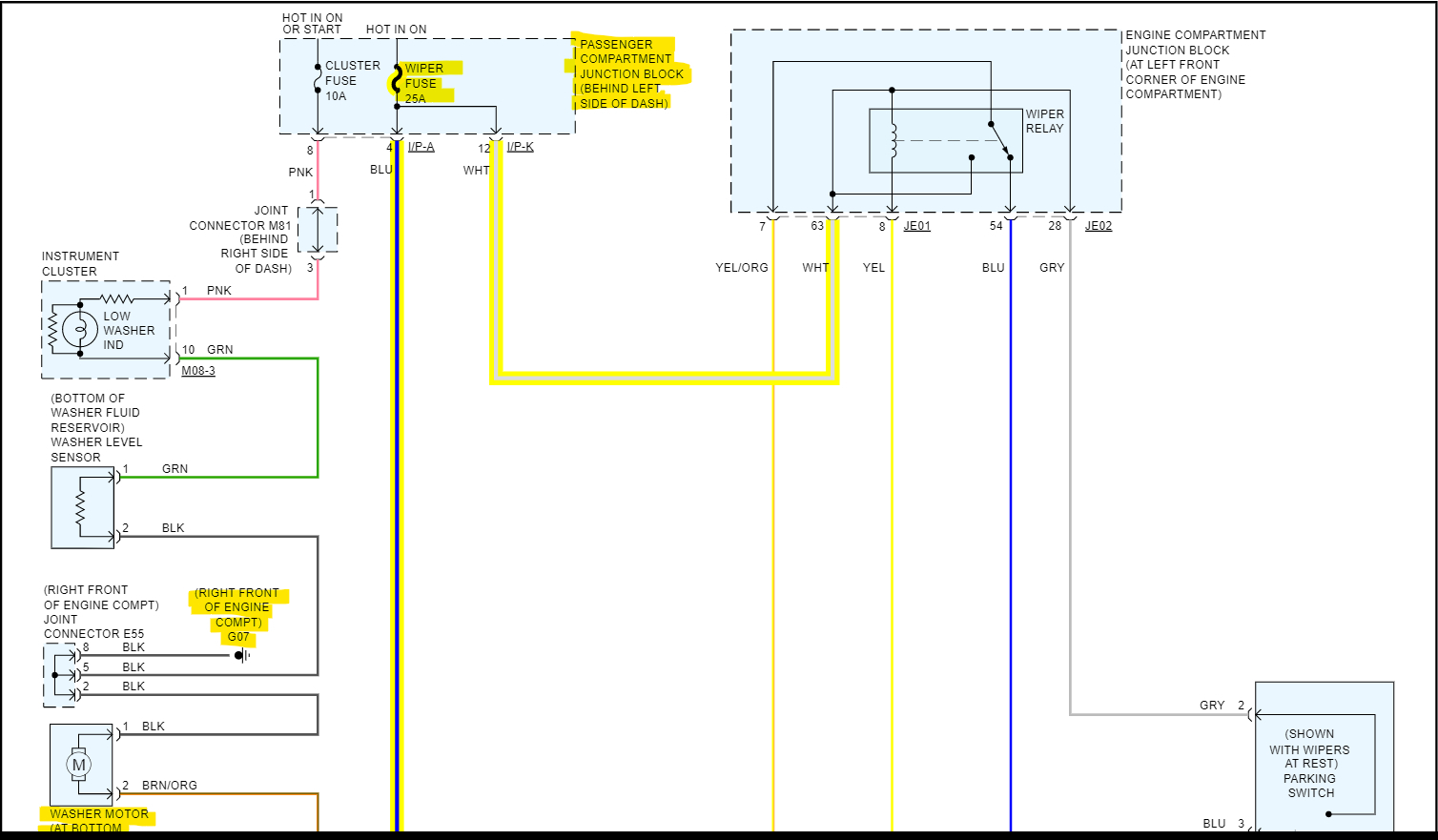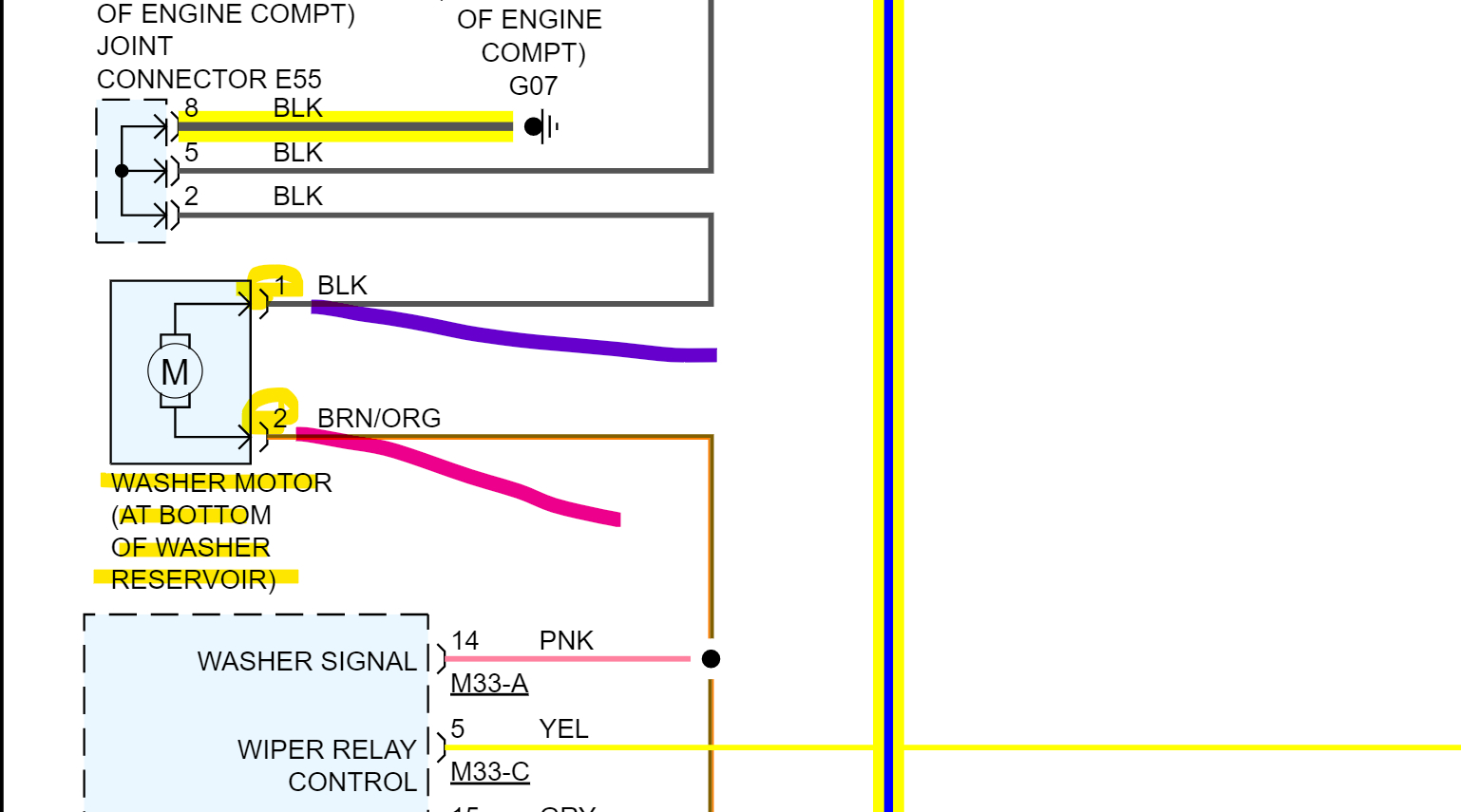 In the last diagram you can see the Ground connection for the washer motor and washer reservoir level sensor. Marked in green G07. It's located in the engine compartment but it's easier to just check using a test light across the two wires on the washer motor plug.