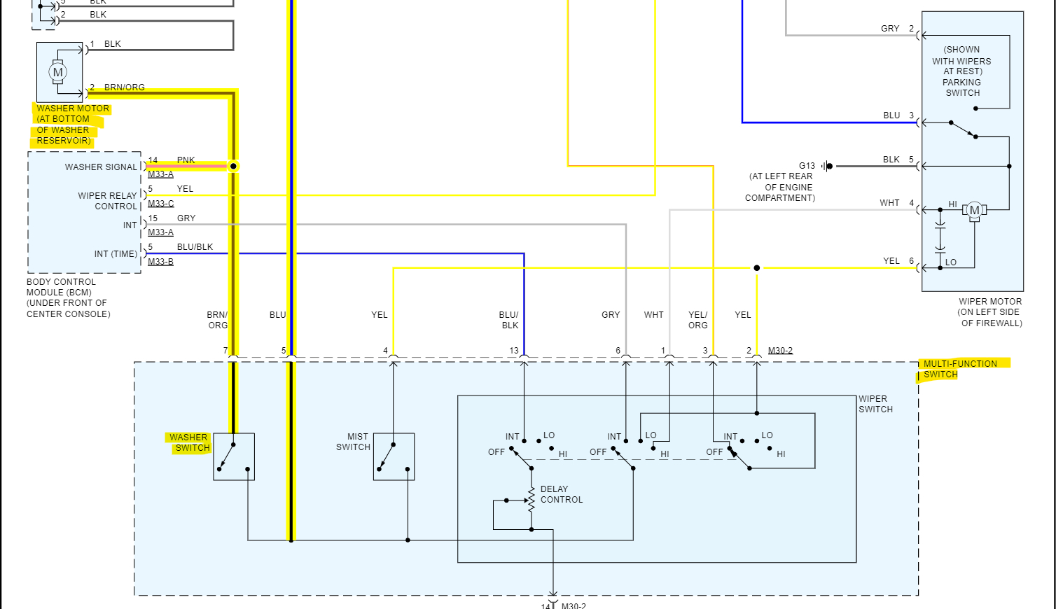 The 1st diagram shows the fuse that feeds the wiper and washer motors, the second is where the circuit splits off for the wiper motor and then to the multifunction switch for the washer motor. The third is the switch, so you may have a switch malfunction or a bad ground connection for the washer motor. The easiest way to check this is to unplug the washer wiring harness plug and use a test light or multimeter to check for 12volt power across the washer motor harness plug while someone pushes the washer switch for you.