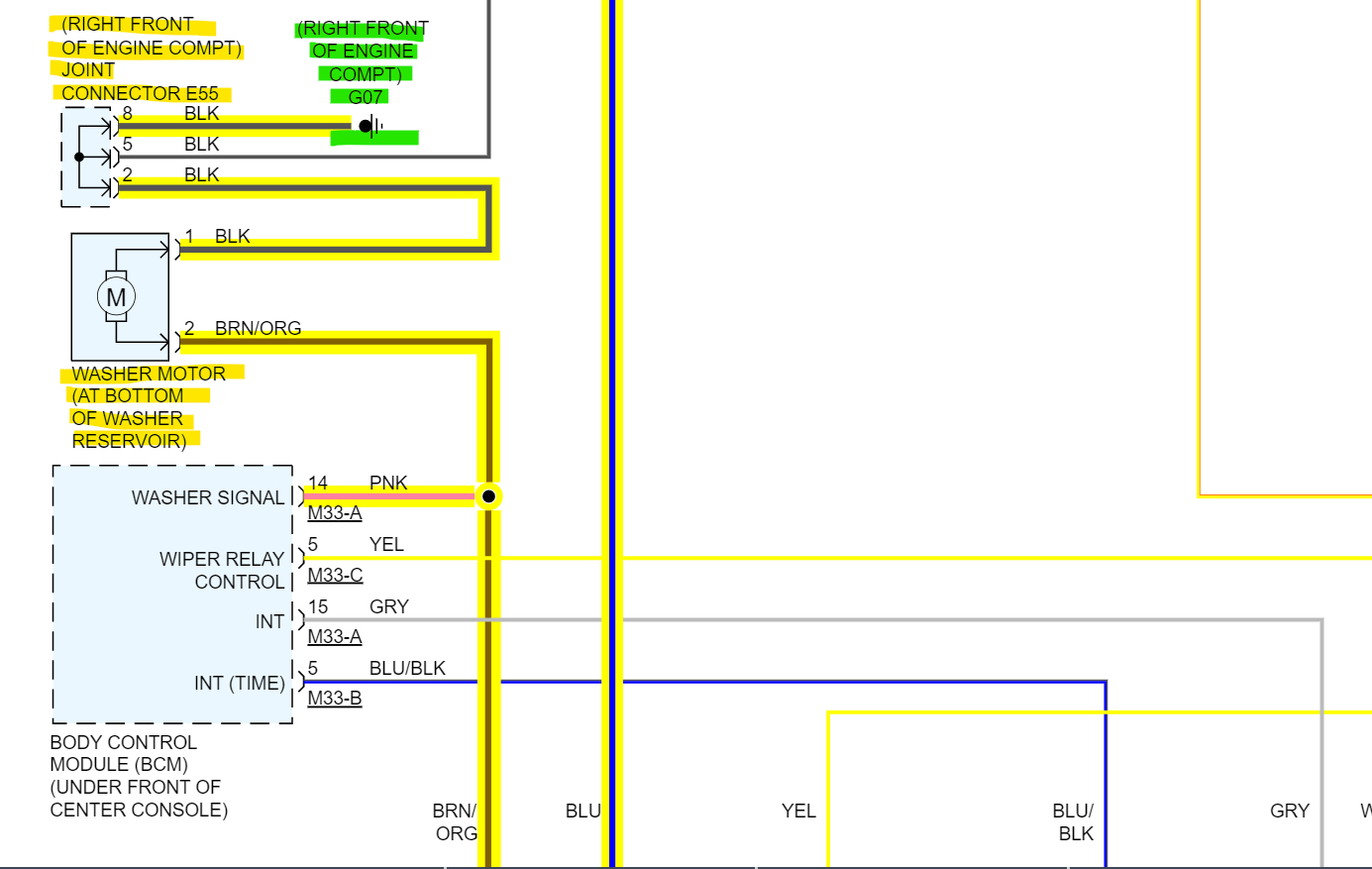 Here are two guides to help with testing. If the test light does not light, try switching the test light clip to the battery negative post and test again. This will tell you if there is bad ground for the washer motor. And then the G07 ground will need to be checked. If you have any questions on testing just ask.