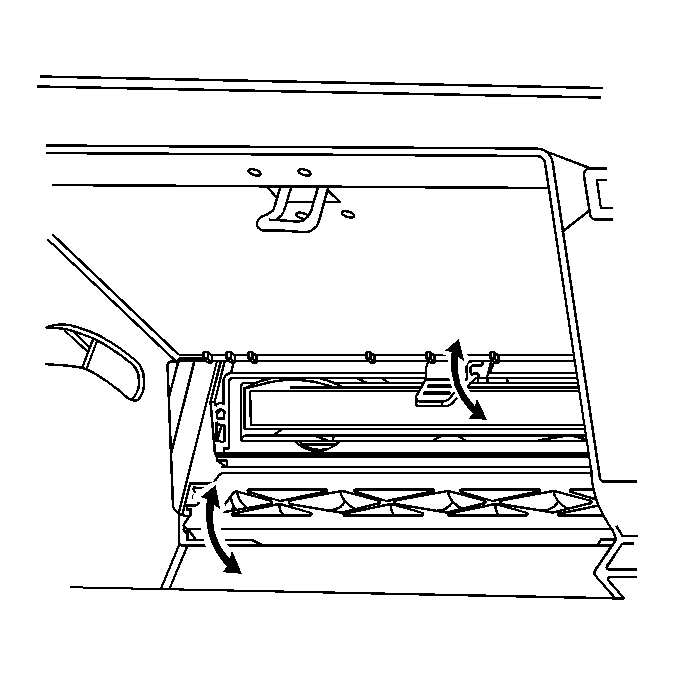 Open the passenger compartment filter door by reaching through the opening in the rear of the instrument panel compartment and raising the tab until the door can be opened downward. See Fig. 2.