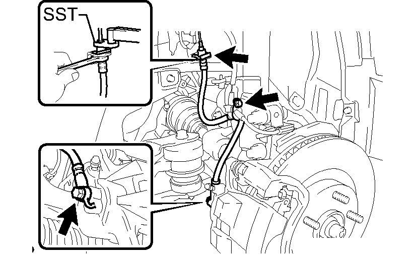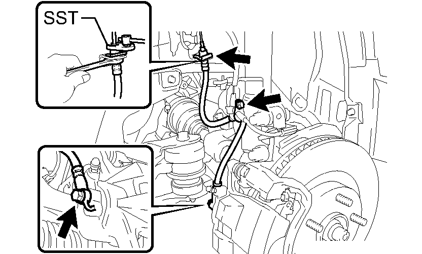 (b) Remove the brake tube with SST while holding the front brake flexible hose with a wrench.