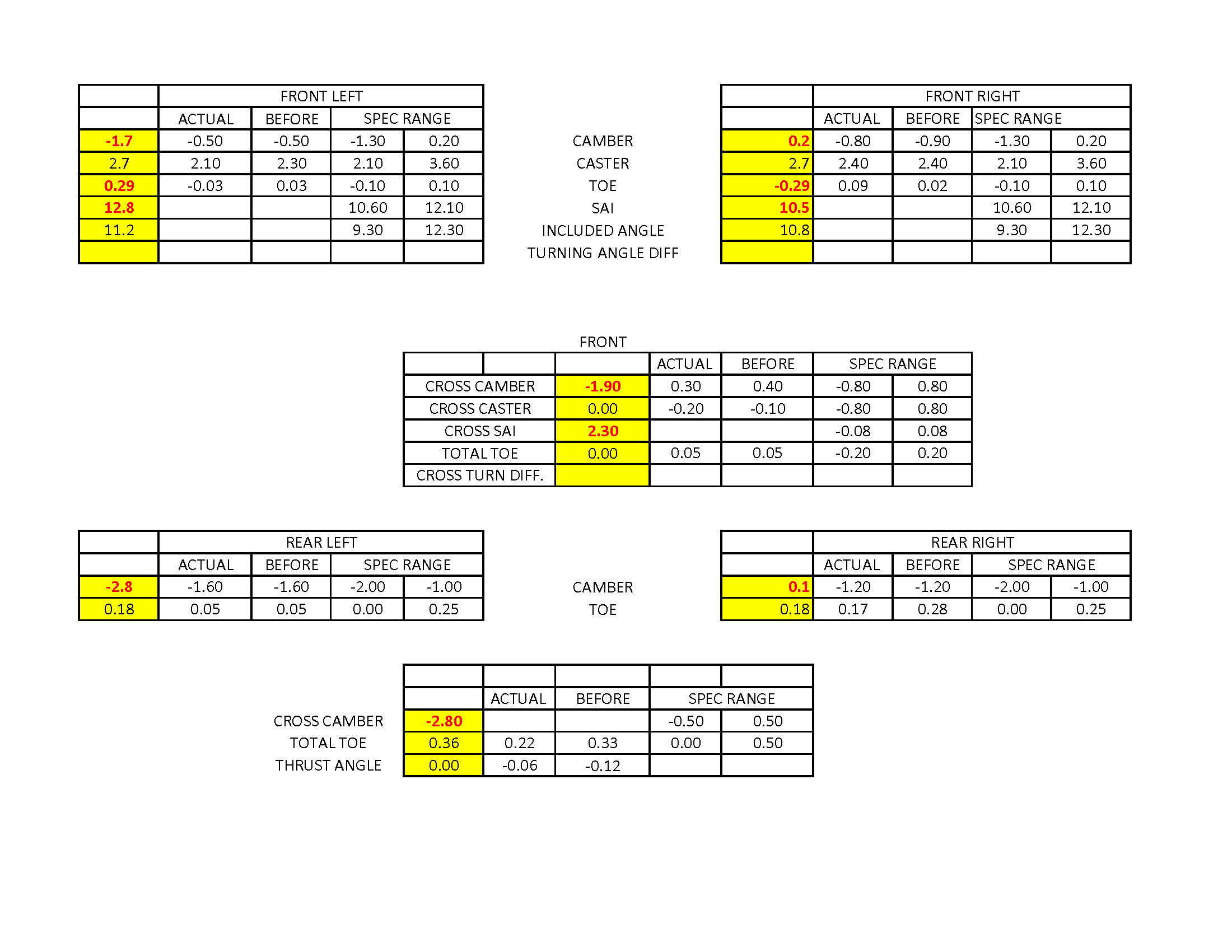 Not to mention that you might need new suspension parts just to get it to align becasue they are very far out of spec. The spec I found for front camber is -.32degrees give or take.45degrees. So the front right is leaning with the top out, so the whole car is leaning to the right in front. I do not have cross camber to check specs. However this is probably total camber from front left ro right rear.