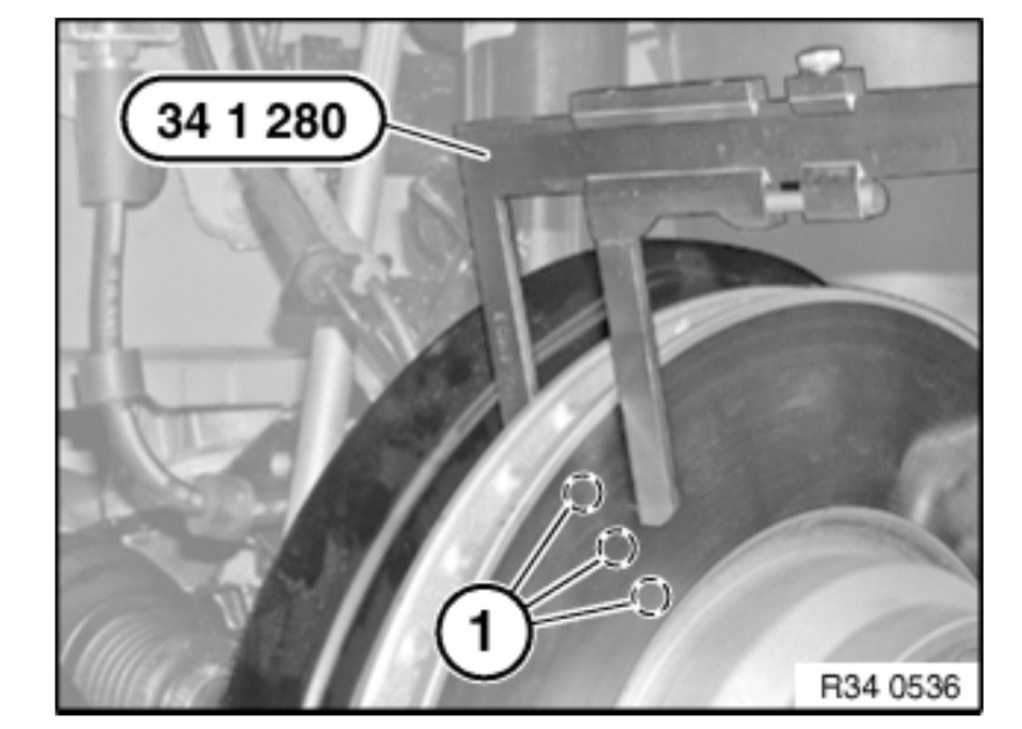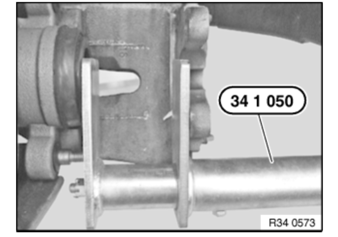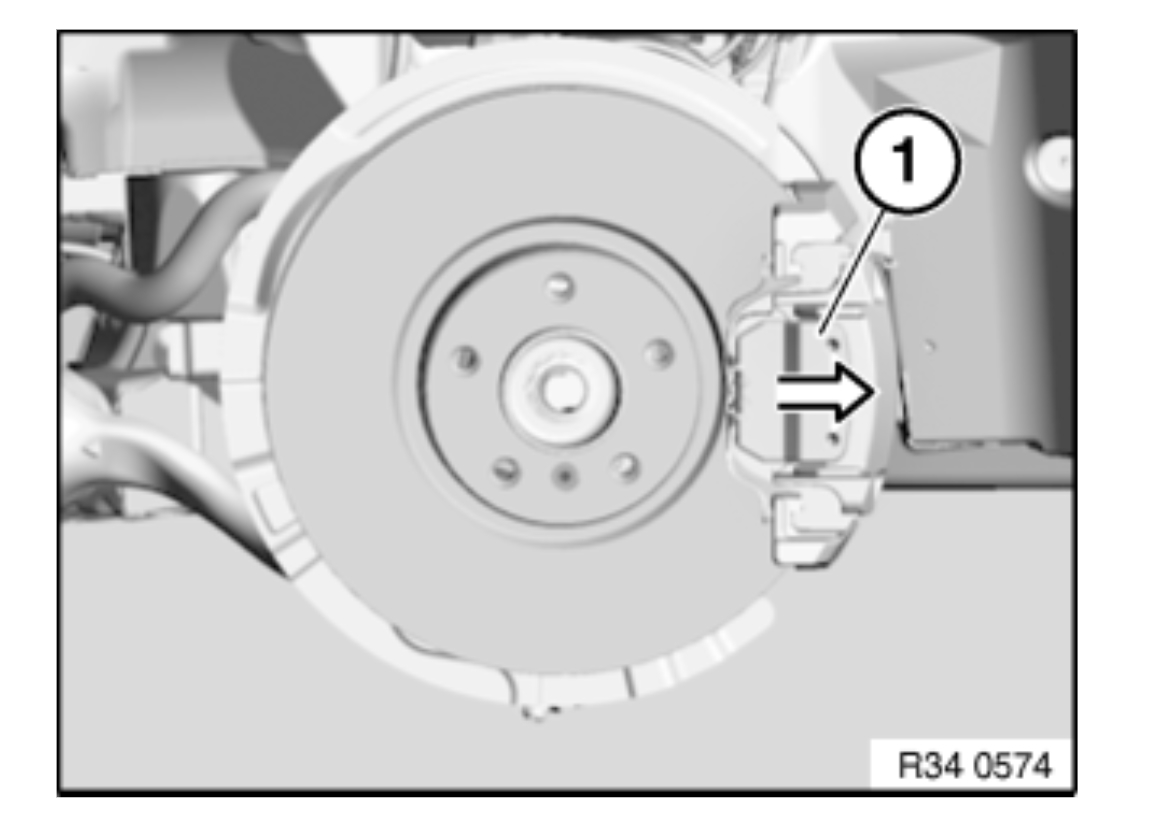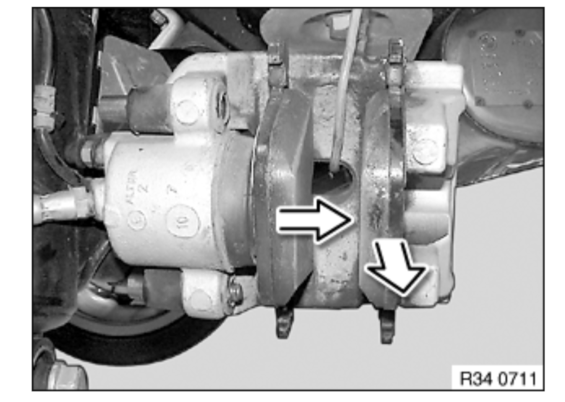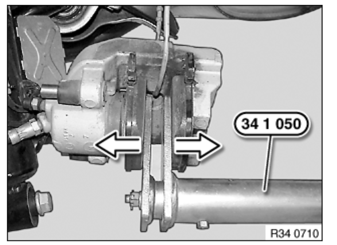 Turn piston back fully with special tool 34 1 050. In the event of one-sided brake pad wear, do not change brake pads round.