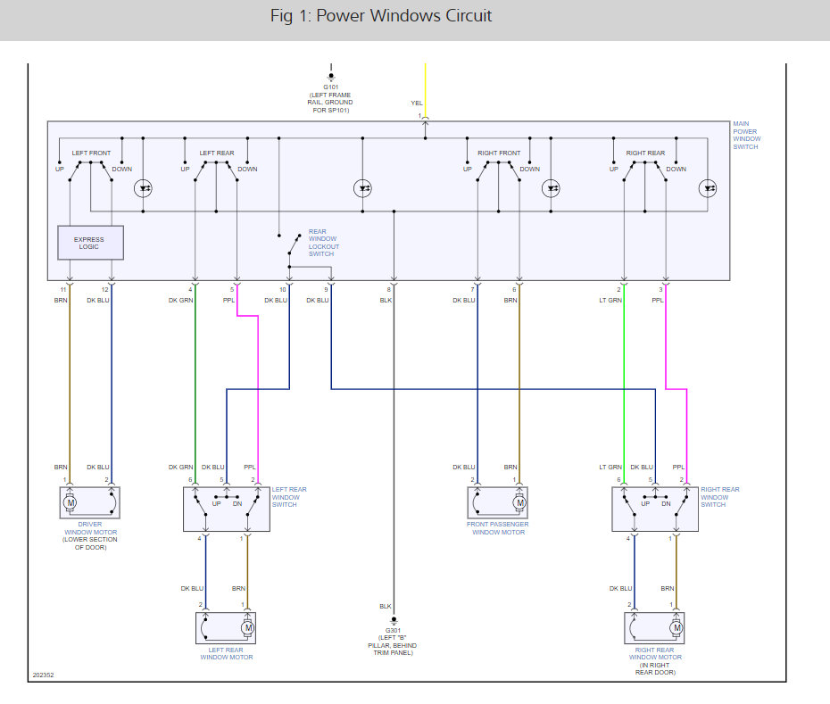 Drivers window doesnt work, regulator good, power to up motor terminal no power to down motor terminal, window goes down when buzzed with external source. Buzzed up terminal but motor did not work. Brown wire is down and blue wire is up.