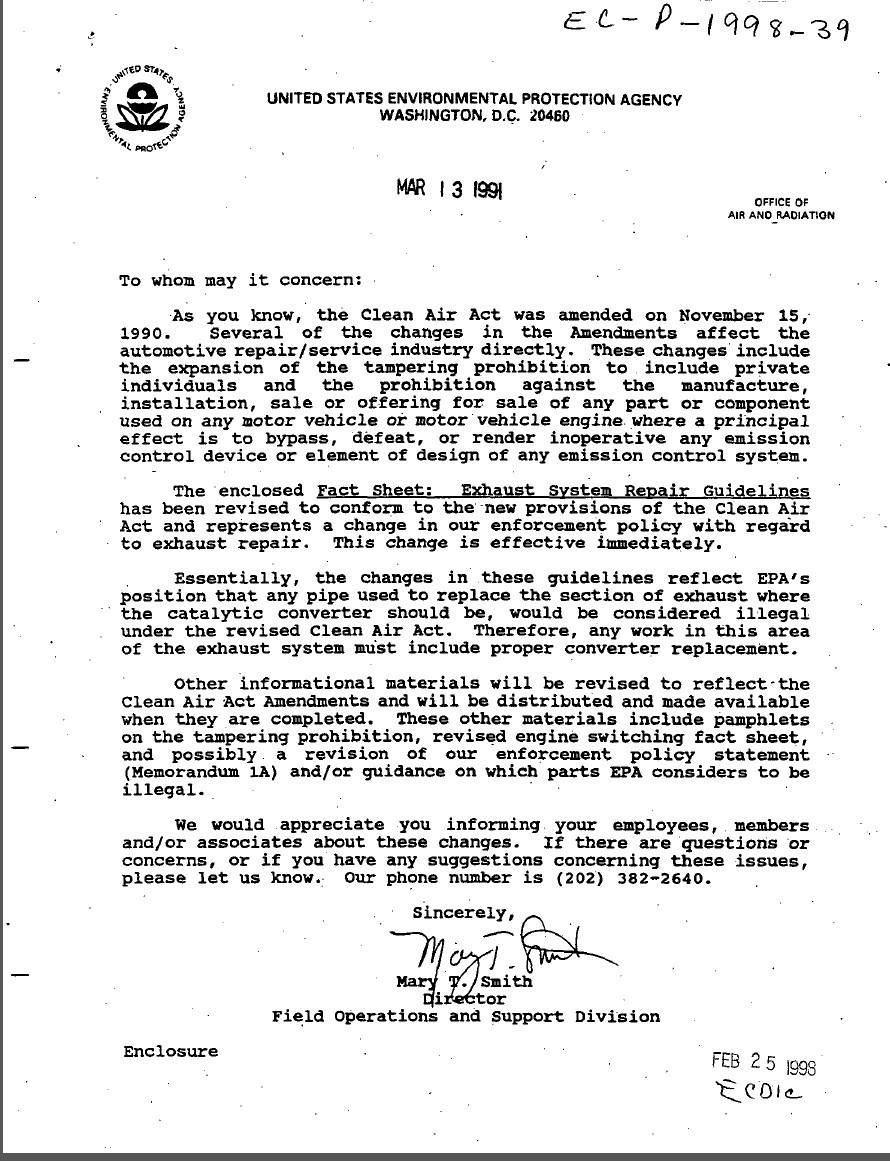 Revisions to the U.S. Clean Air Act in 1990 (40 CFR Title 2, Part A, Section 203) further broadened the definition of emissions tampering to include virtually ANY type of engine or exhaust system modification, performed by anyone, that alters, or might alter, what comes out the tail pipe. That means any nonstock aftermarket part that is installed on your engine must be EPA-approved and emissions legal (except on the exempt vehicles noted below) if you will be driving on public roads. Canadian federal clean air laws are very similar.