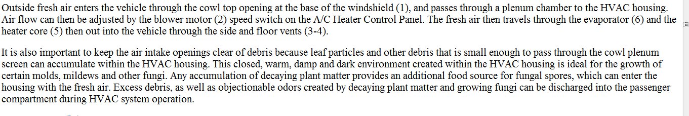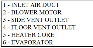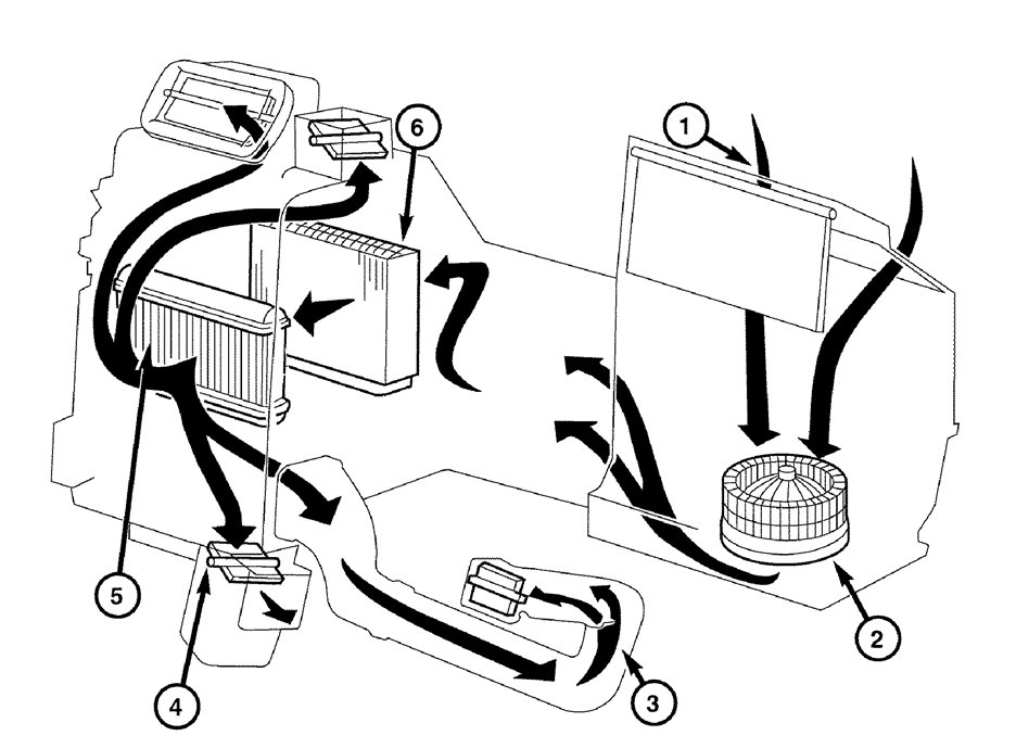 The fresh air system lets in the air in a few interesting areas, the side most vents and the vents under the seats. It does pass through the system first as you will read in the provided air flow description, including going through both the Evaporator, which cools air and the Heater Core, which heats air.
