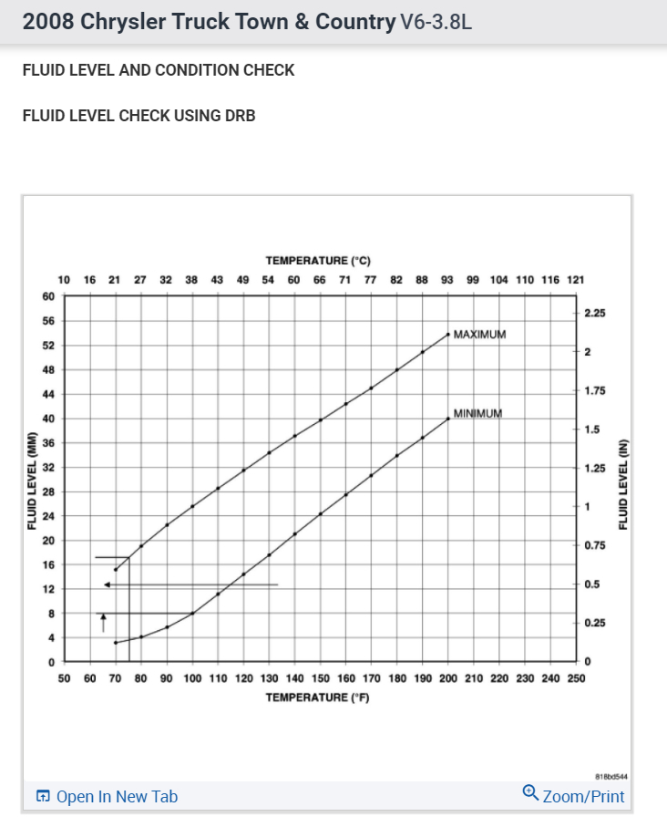 The transmission Oil Dipstick (special tool #9336A, Dipstick) has indicator marks every 1 mm. Determine the height of the oil level on the dipstick and using the height, the Transmission Fluid Temperature (TFT) as viewed with the scan tool, and the Transmission Fluid Graph, determine if the transmission oil level is correct.