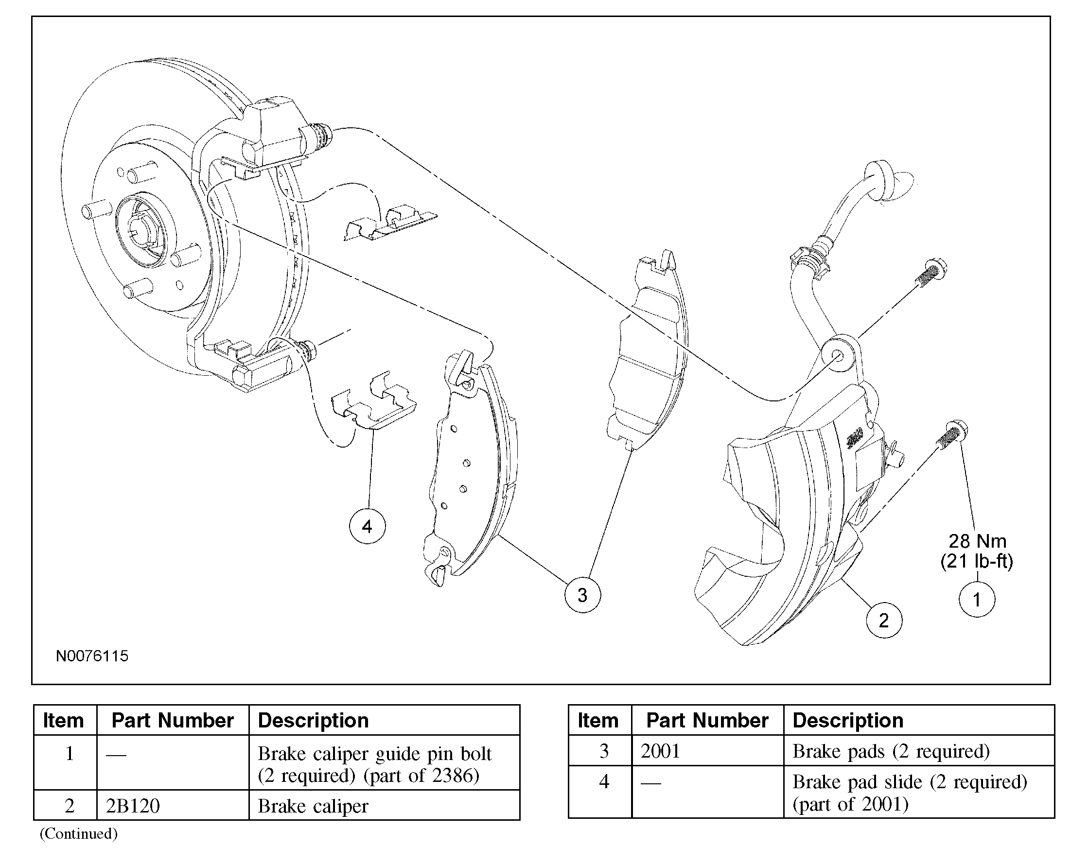 CAUTION: Do not allow the brake caliper to hang from the brake caliper flexible hose or damage to the hose can occur.