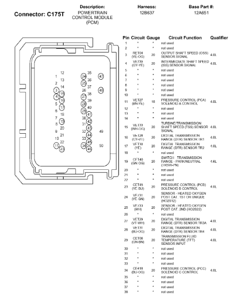 There is no communication with the PCM through obd2. Also, the PCM port for the starter relay doesn’t read anything. I’ve narrowed it down to the PCM ground at the fuse box at the very least. I’m trying to test the wire harness on the PCM end and the different grounds and ports involved. I’m looking for a diagram or pin out for the PCM. It says HCZ1on it which corresponds to the 12A650 model. I saw somebody else sharing diagrams for an older explorer in a thread about the 12A651 I think and I’m wondering if they are the same layout for the various explorer and sports trac styles.