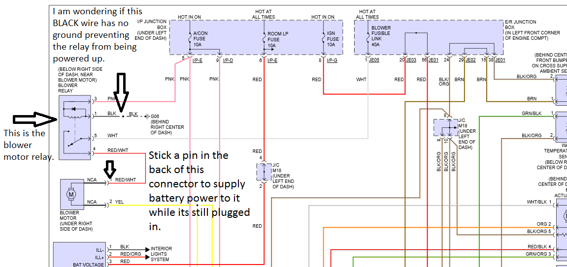 There is a relay located near the blower motor itself, under the dash on the same side, as for back probing the connector, leave the blower plugged in and stick a pin into the back of the connector where the red/white wire goes in so you are feeding power to that wire instead of it coming from the relay. This way the control unit can still do its job but the blower motor is just getting power from a different source. Then you will know it is just a power issue and there is nothing wrong with the ground circuits. I only say to do this since you already have a power wire running to it from the battery.