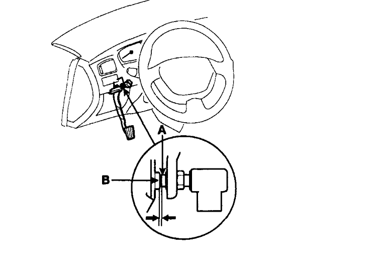Screw in the brake switch until its plunger is fully depressed (threaded end (A) touching the pad (B) on the pedal arm) then adjust the switch 3/4 turn to until clearance between the brake switch connector. Make sure
