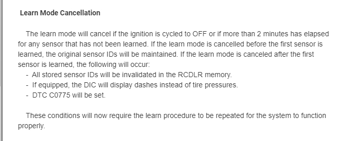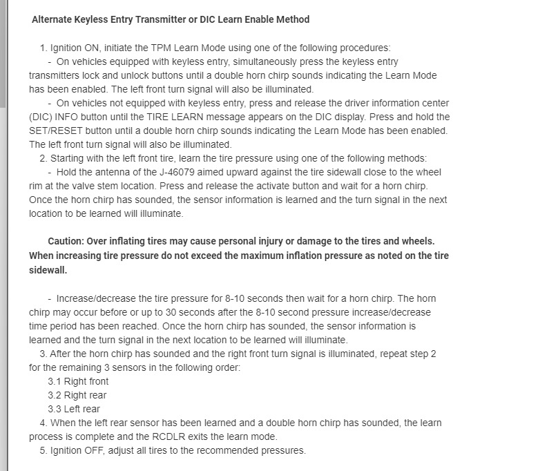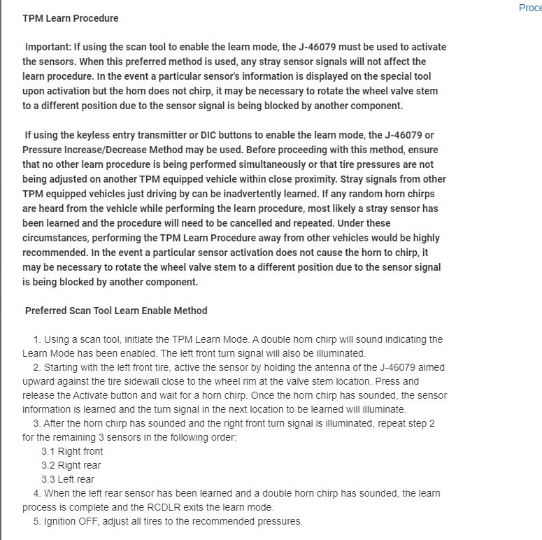 I just had new TMPS sensors installed for each tire. Using the key fob, the vehicle will not go into the relearn process to relearn the sensors. Any help?