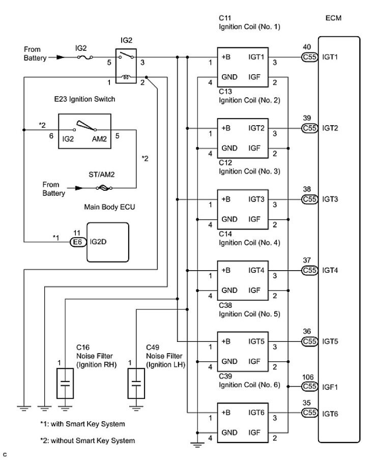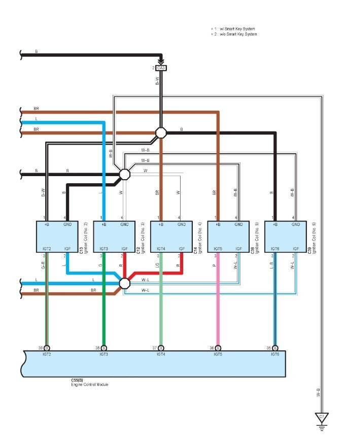 The 3.5 V6 firing order is simple 1-2-3-4-5-6 The cylinder layout is in the image. In the wiring diagram they were not nice. Although they used different colors for each coil, they all share three of the connections. Battery power on pin 1, Grounds on pin 4, the Ignition Feedback on pin 2. The Ignition Triggers on pin 3 are the only ones that are actually different as those determine the firing order.