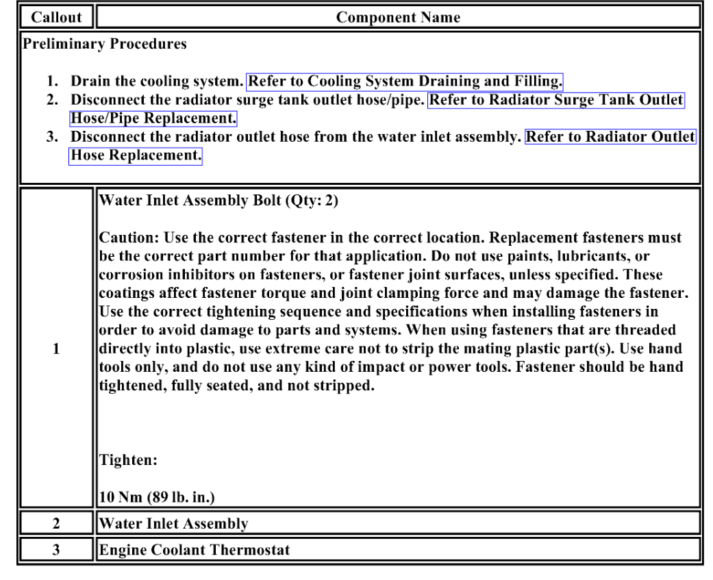 A NEW thermostat cover O-ring seal into the recess groove The thermostat The thermostat cover bolts and tighten to 89 inch lbs. (10 Nm) The oil cooler inlet and outlet hoses to the thermostat cover The oil cooler inlet and outlet hose clamps at the thermostat cover The radiator surge tank outlet hose to the thermostat cover The radiator surge tank outlet hose clamp at the thermostat cover