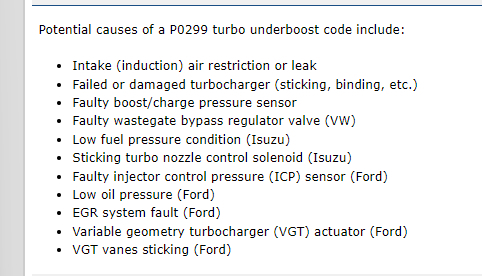 Past month I have been having a very intermittent fault (fault code po299). A garage said its an under boost condition. I can be driving along fine at 70-80 MPH but if I go to take over a car or go up a steep hill (putting load on the engine) it will start to loose power then loose all turbo power and the powertrain light comes on and it goes into limp mode. The engine light has come on with it too some times. Then if I pull over turn off my car and start it up again all power is restored and drives fine till its put under load again. The turbo sounds fine and there is no movement on the internal rod. I have checked all the turbo pipes in and out of the turbo ect no cracks or splits. No blockages in the air intake pipes etc.