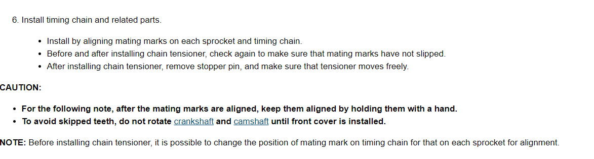 For a Nissan Urvan/Caravan, 2.5l DOHC, 2008, variable timing, gasoline. Can anyone help? We removed our chain tensioner to replace after the mechanic told us that it needed changing due a rattling noise on start-up. When we looked at the old tensioner on the engine we noticed that the plunger had traveled past the sealing o-ring. We concluded that the chain assembly should be changed as well. We tried putting the engine on timing marks so we could remove the chain and install a new one with no problems (our first time doing the Nissan) but we were not aware that the chain would slip because of no oil pressure. We are now searching for assistance to align the crank and cam shafts correctly to re-install our new chain. Thanks for help.