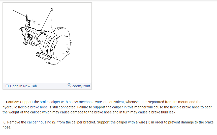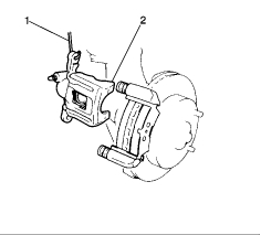 Caution: Support the brake caliper with heavy mechanic wire, or equivalent, whenever it is separated from its mount and the hydraulic flexible brake hose is still connected. Failure to support the caliper in this manner will cause the flexible brake hose to bear the weight of the caliper, which may cause damage to the brake hose and in turn may cause a brake fluid leak.
