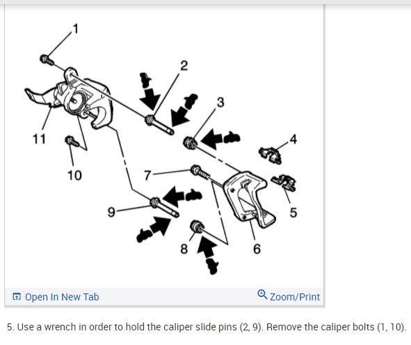 Use a wrench in order to hold the caliper slide pins (2, 9). Remove the caliper bolts (1, 10).