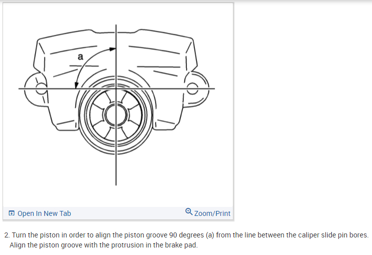 Turn the piston in order to align the piston groove 90 degrees (a) from the line between the caliper slide pin bores. Align the piston groove with the protrusion in the brake pad.