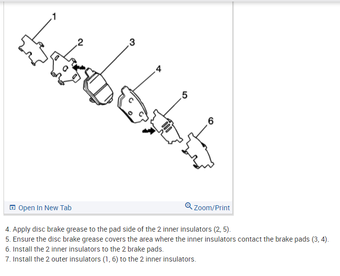 Apply disc brake grease to the pad side of the 2 inner insulators (2, 5).