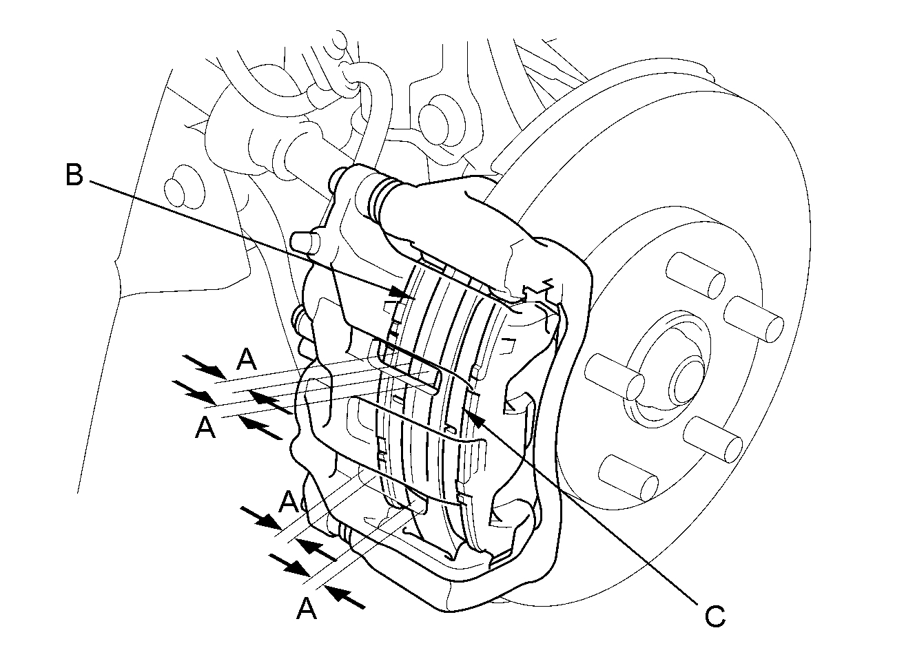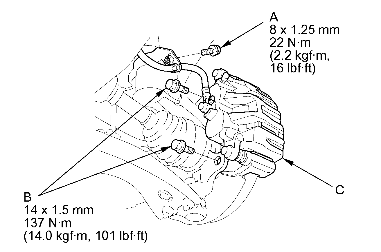 4. Remove the brake caliper bracket mounting bolts (B), then remove the caliper assembly (C) from the knuckle. To prevent damage to the caliper assembly or the brake hose, use a short piece of wire to hang the caliper assembly from the undercarriage. Do not twist the brake hose excessively.
