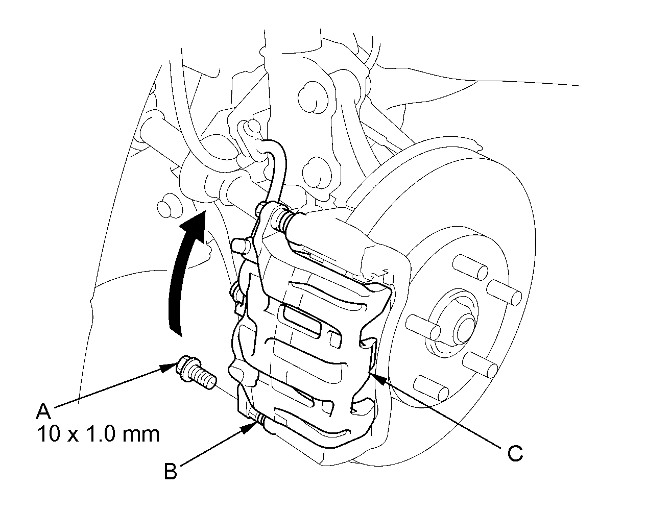 4. Remove the flange bolt (A) while holding the caliper pin (B) with a wrench. Be careful not to damage the pin boot, and pivot the caliper (C) up out of the way. Check the hose and pin boots for damage and deterioration.