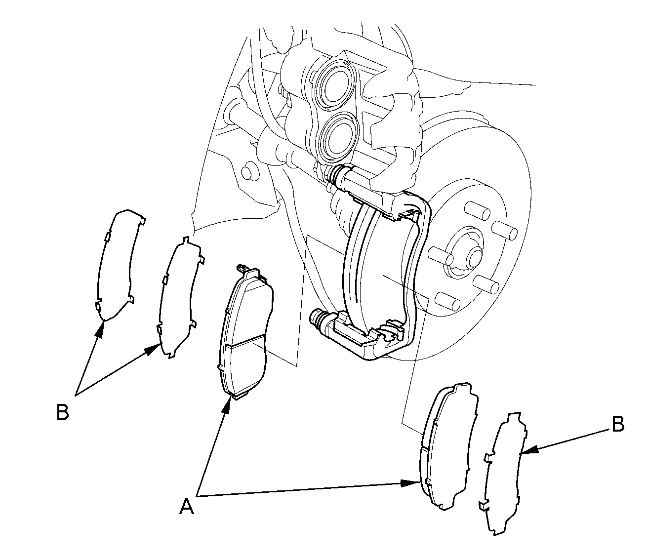 5. Remove the brake pads (A) and the pad shims (B).