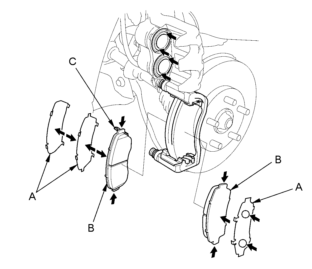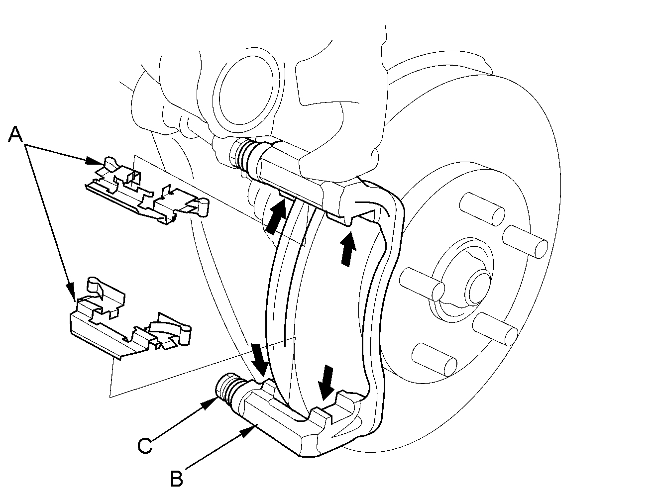15. Install the brake pads and pad shims correctly. Install the brake pad with the wear indicator (C) on the upper inside. If you are reusing the brake pads, always reinstall the brake pads in their original positions to prevent a temporary loss of braking efficiency.