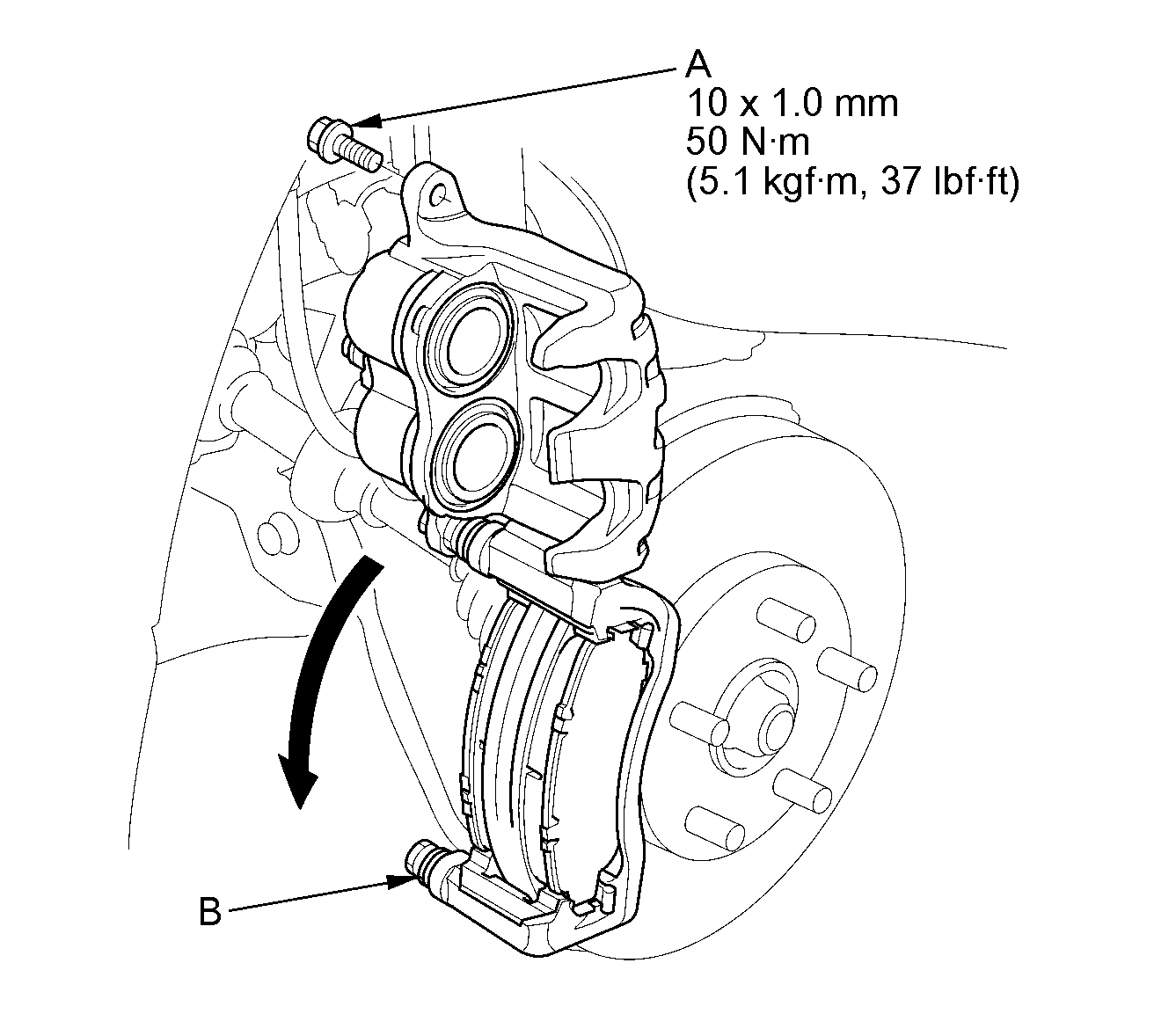 16. Pivot the caliper down into position. Install the flange bolt (A), and tighten it to the specified torque while holding the caliper pin (B) with a wrench being careful not to damage the pin boot.