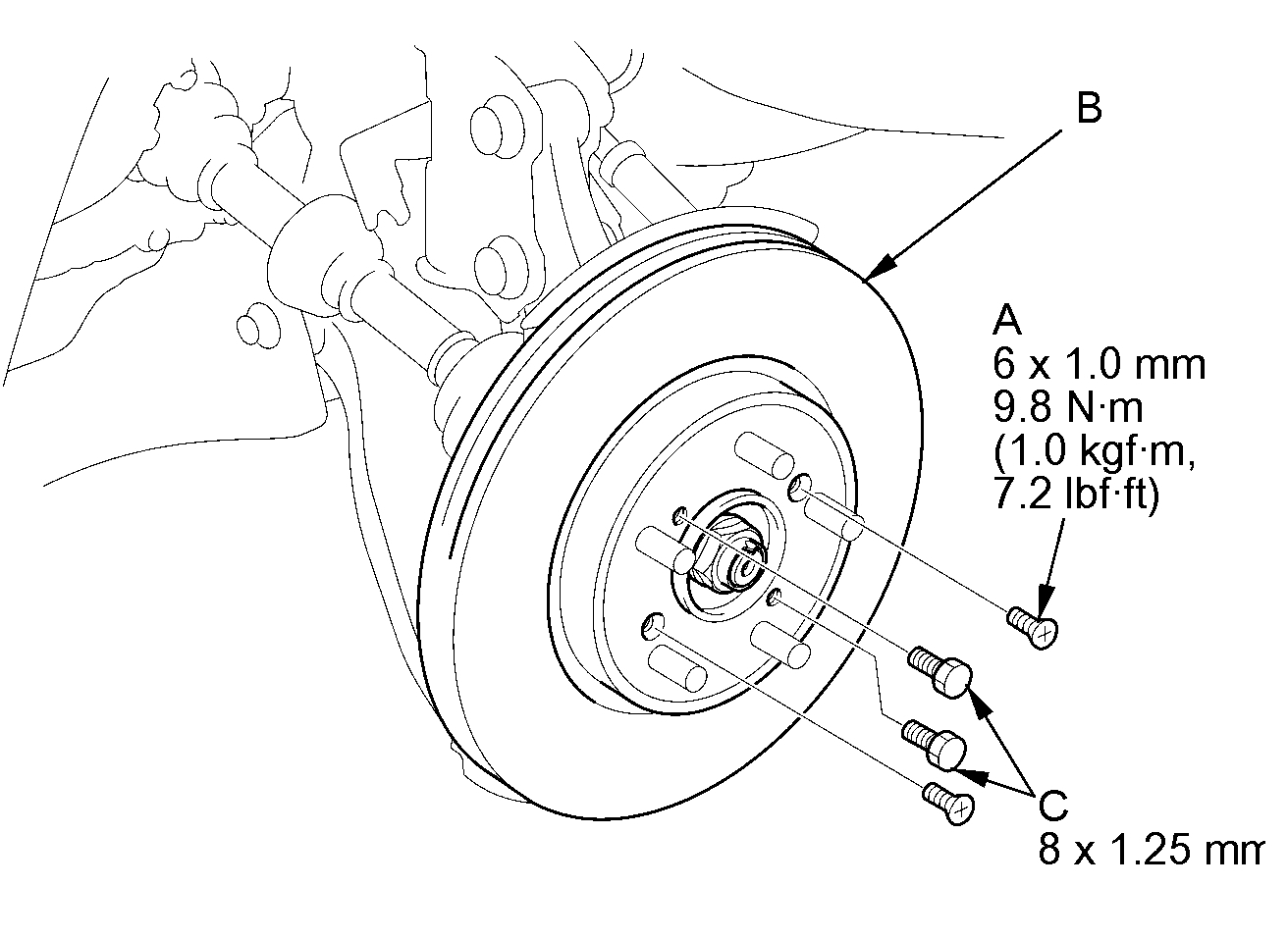 NOTE: If the brake disc is stuck to the front hub, thread two 8 x 1.25 mm bolts (C) into the brake disc to push it away from the front hub. Turn each bolt 90 degrees at a time to prevent the brake disc from binding.