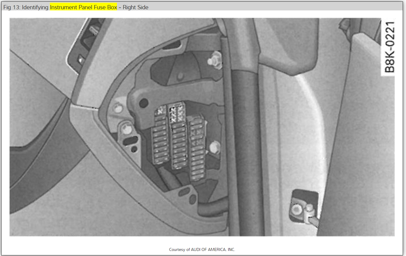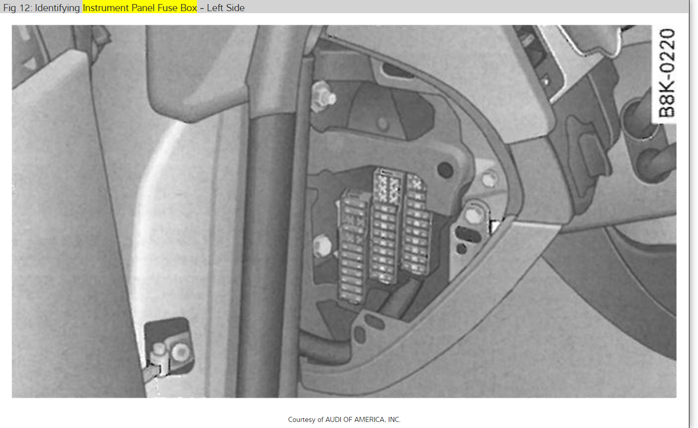Thanks Thomas, I found the relay and fuse panel, you have to remove a very large cowl cover and the washer fluid reservoir filler neck to get at it. There are 3 relays and no identification diagram so I'm not sure which one it is and have never tested a relay before. Any idea where to find.A fuse box diagram for the Q5? Thanks again.