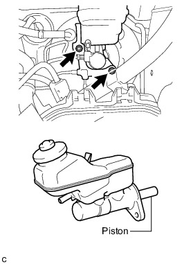 when installing the master cylinder to the brake booster, or when removing the master cylinder from the brake booster, make sure that the master cylinder is kept horizontal or its tip faces downward (the piston faces upward) to prevent the master cylinder piston from falling off.