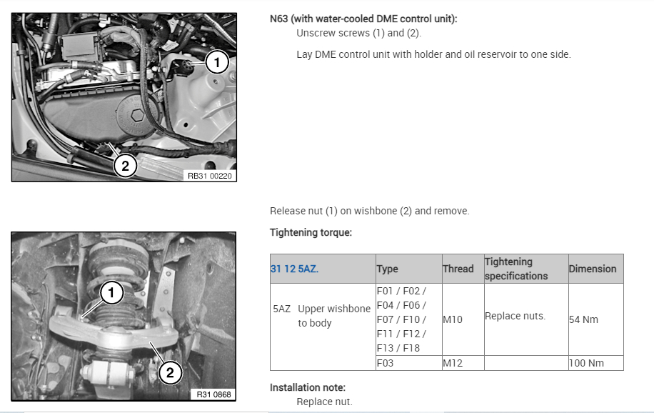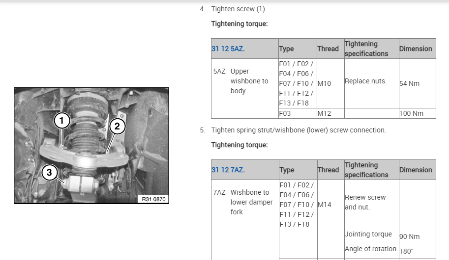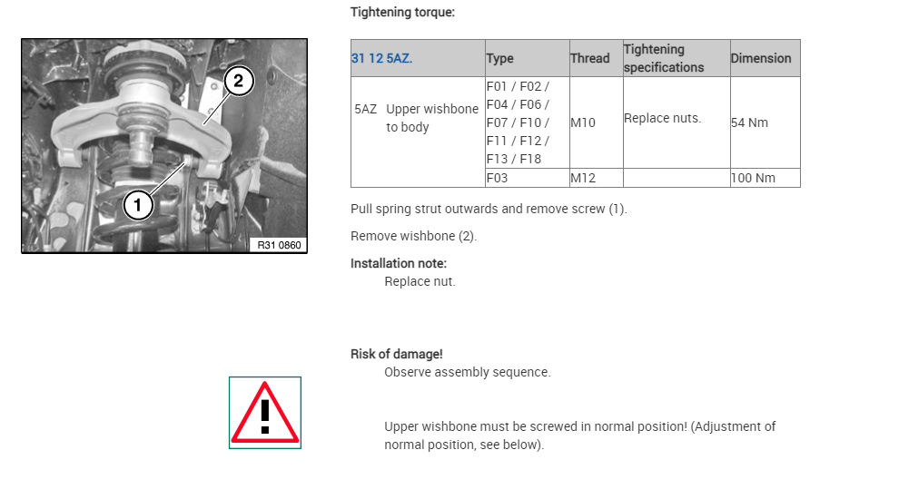 Thanks in advance for your expertise. After rebuilding the front left/right struts- (reused springs only), I realize a refresh of additional suspension components is needed. Can you please provide the work instructions, torque values, any one-use bolts and pro-tips to replace the front upper controls arms? The best I can tell is I have to access the fasteners by removing some components underneath the hood.
