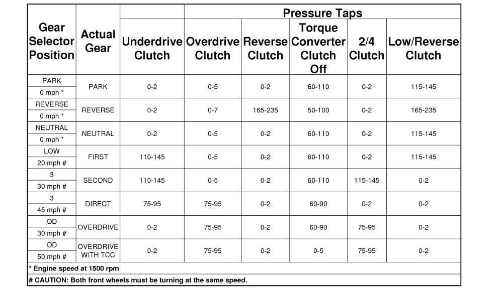 Before performing pressure tests, be certain that fluid level and condition, and shift cable adjustments have been checked and approved. Fluid must be at operating temperature 150 to 200 ° F. (66 to 93 ° C).