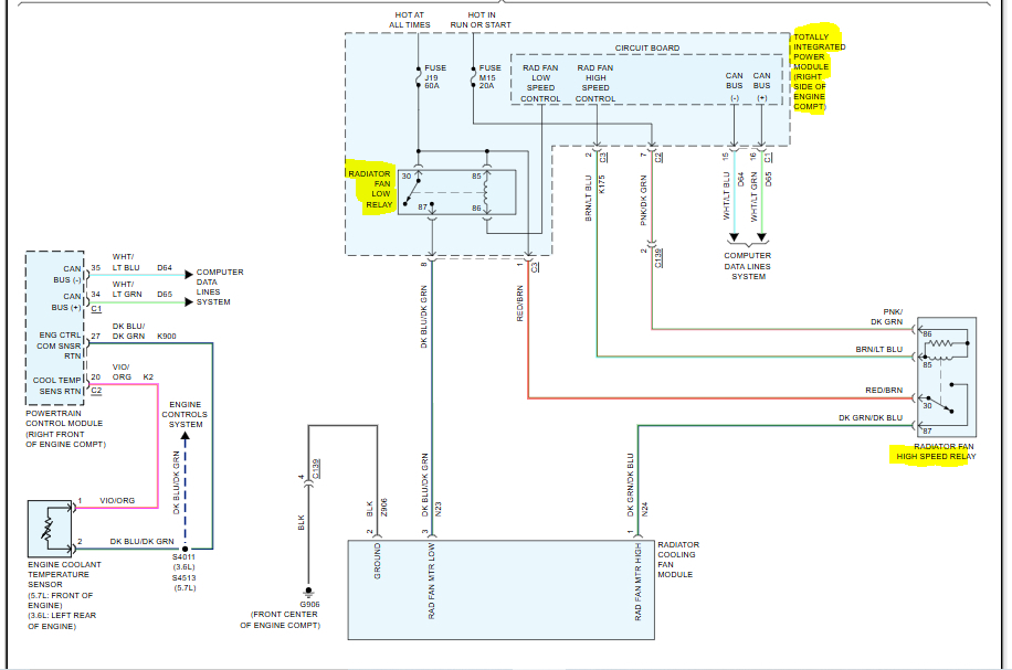 As far as the circuit is concerned, the cooling fan is controlled by the PCM. When needed, a ground signal from the PCM is provided for the Low fan relay. If the conditions require additional cooling, the PCM provides a ground to the High relay.