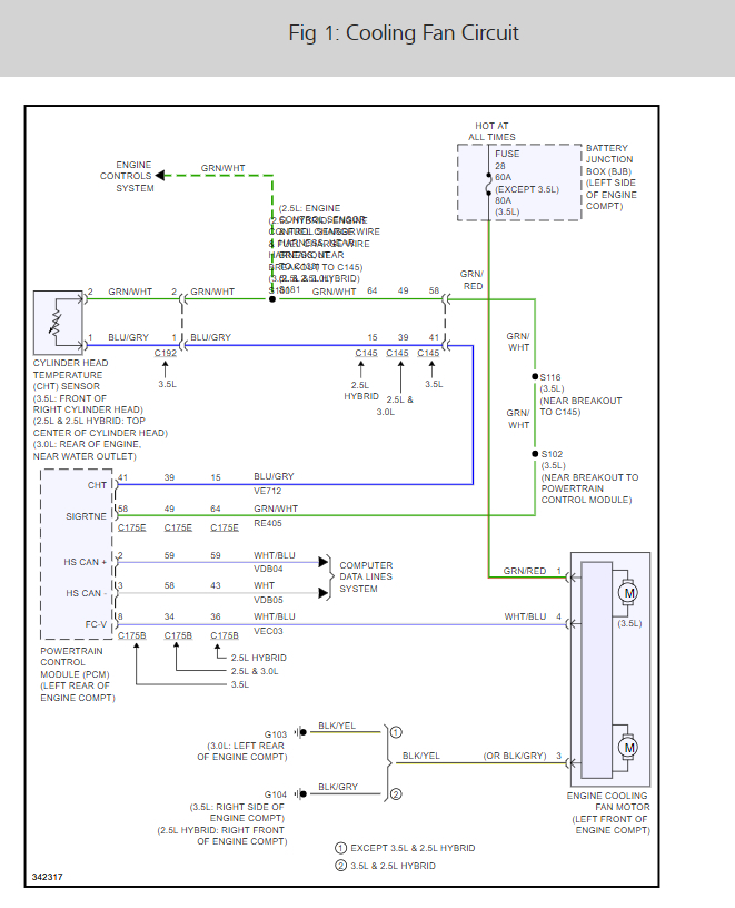 The PCM controls the fan speed and operation using a duty cycle output on the fan control variable (FCV) circuit. The fan controller (located at or integral to the engine cooling fan assembly) receives the FCV command and operates the cooling fan at the speed requested (by varying the power applied to the fan motor).