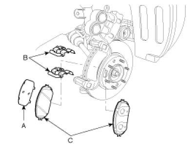 3. Remove pad shim (A), pad retainer (B) and pad assembly (C) in the caliper bracket.