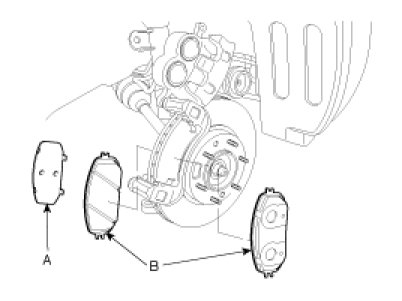 2. Install pad shims (A) and the brake pads (B) with the wear indicator on the inside.