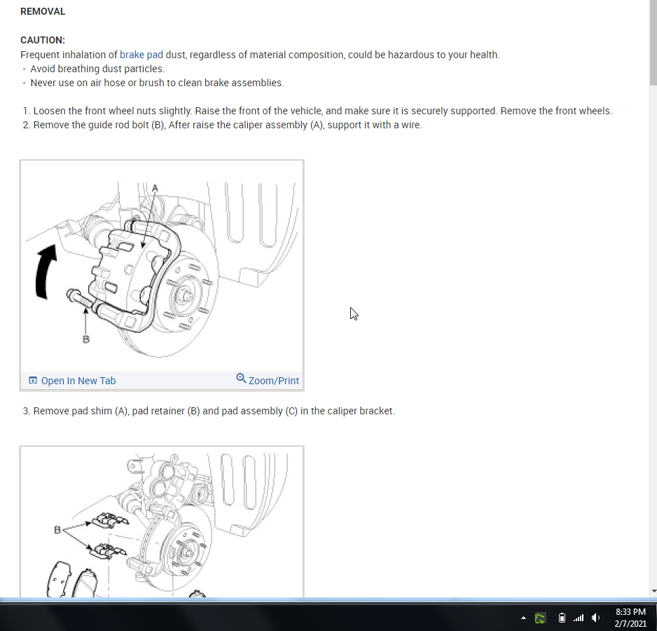 2. Remove the guide rod bolt (B), After raise the caliper assembly (A), support it with a wire.