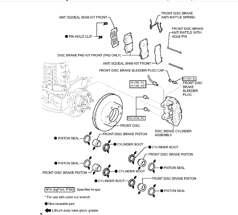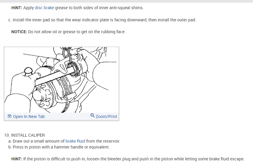 HINT: If the piston is difficult to push in, loosen the bleeder plug and push in the piston while letting some brake fluid escape.