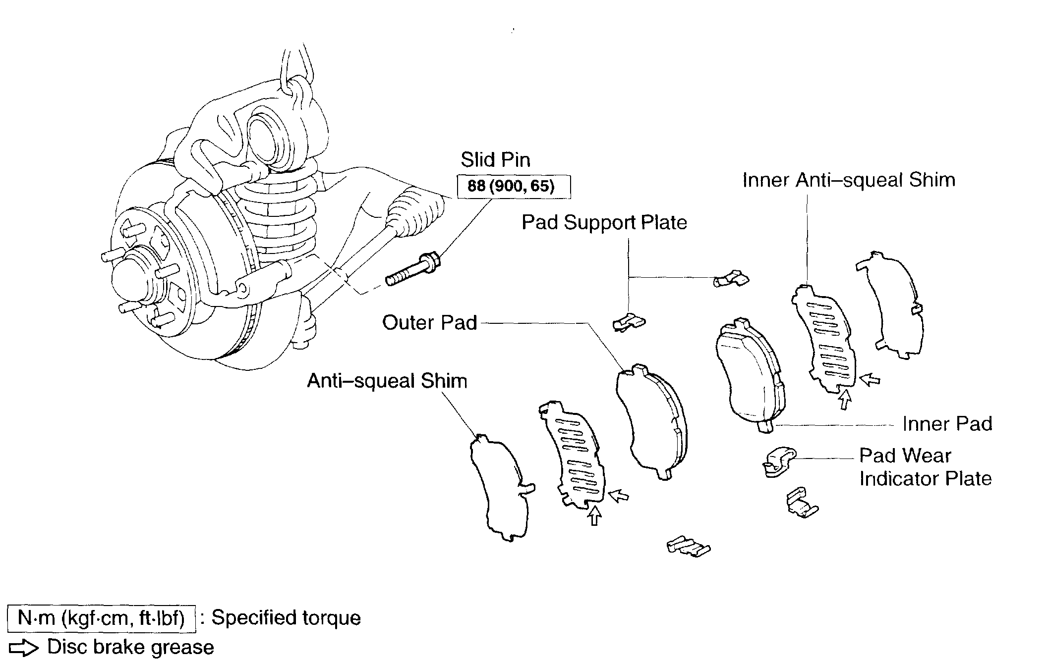 c. Install the inner pad so that the wear indicator plate is facing downward, then install the outer pad.