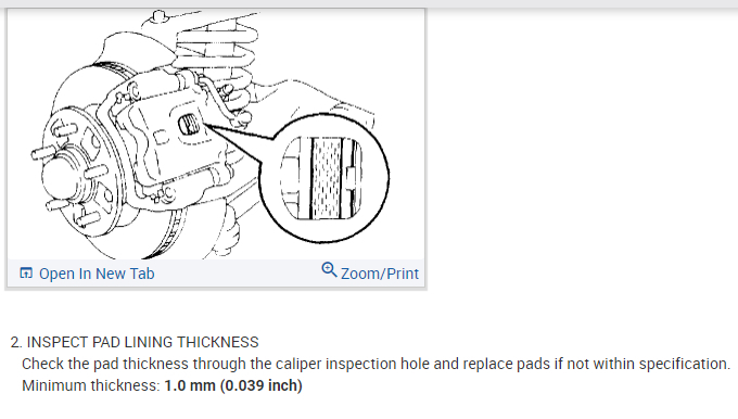 Check the pad thickness through the caliper inspection hole and replace pads if not within specification.