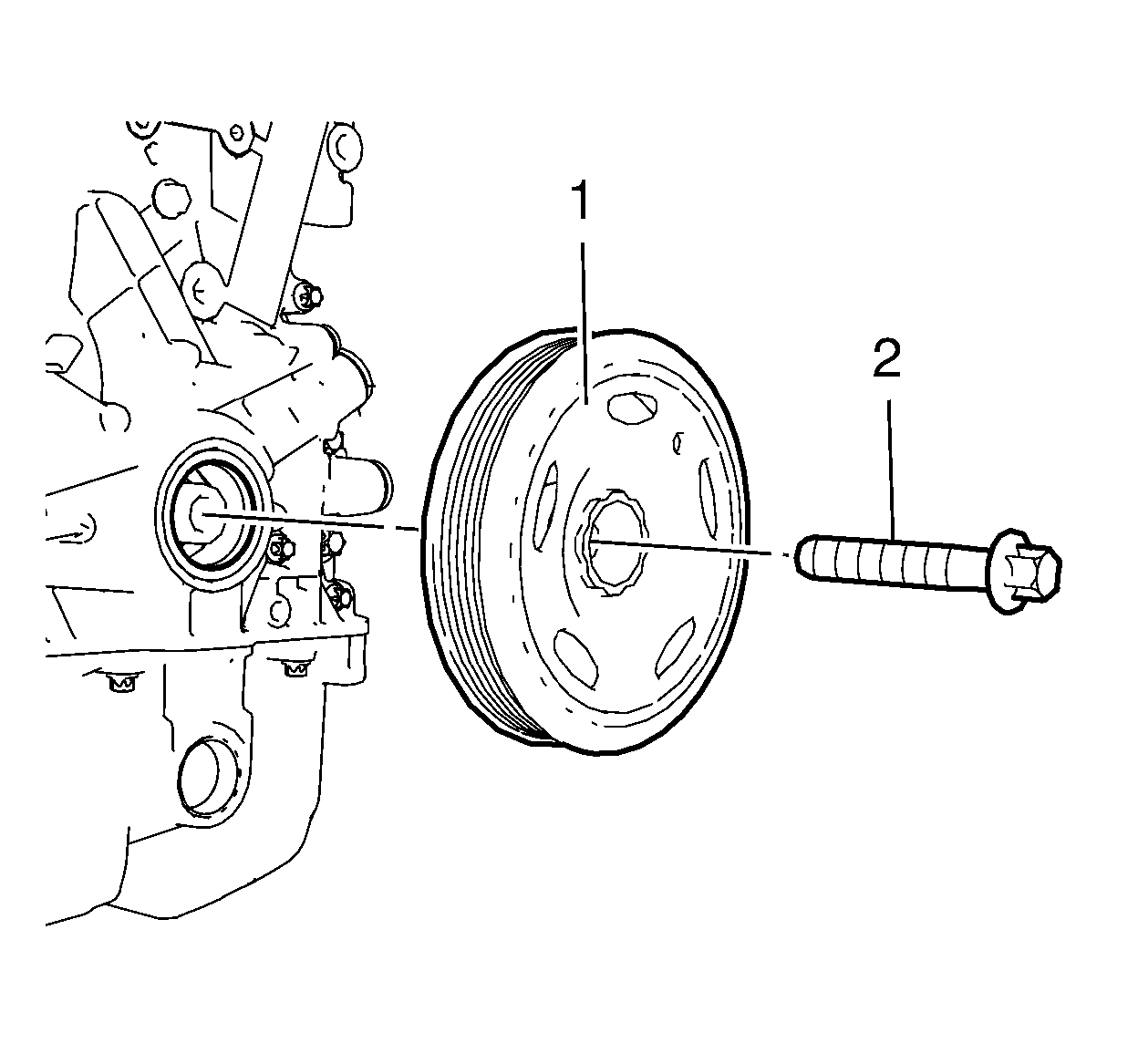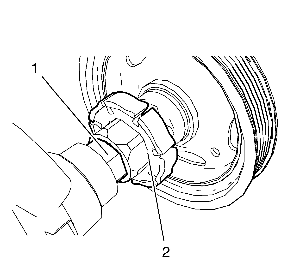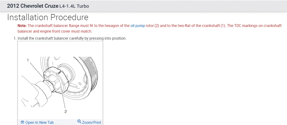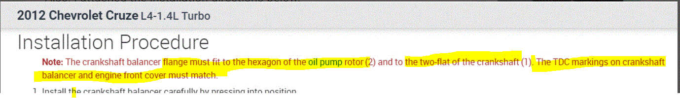 Note: The crankshaft balancer flange must fit to the hexagon of the oil pump rotor (2) and to the two-flat of the crankshaft (1). The TDC markings on crankshaft balancer and engine front cover must match.