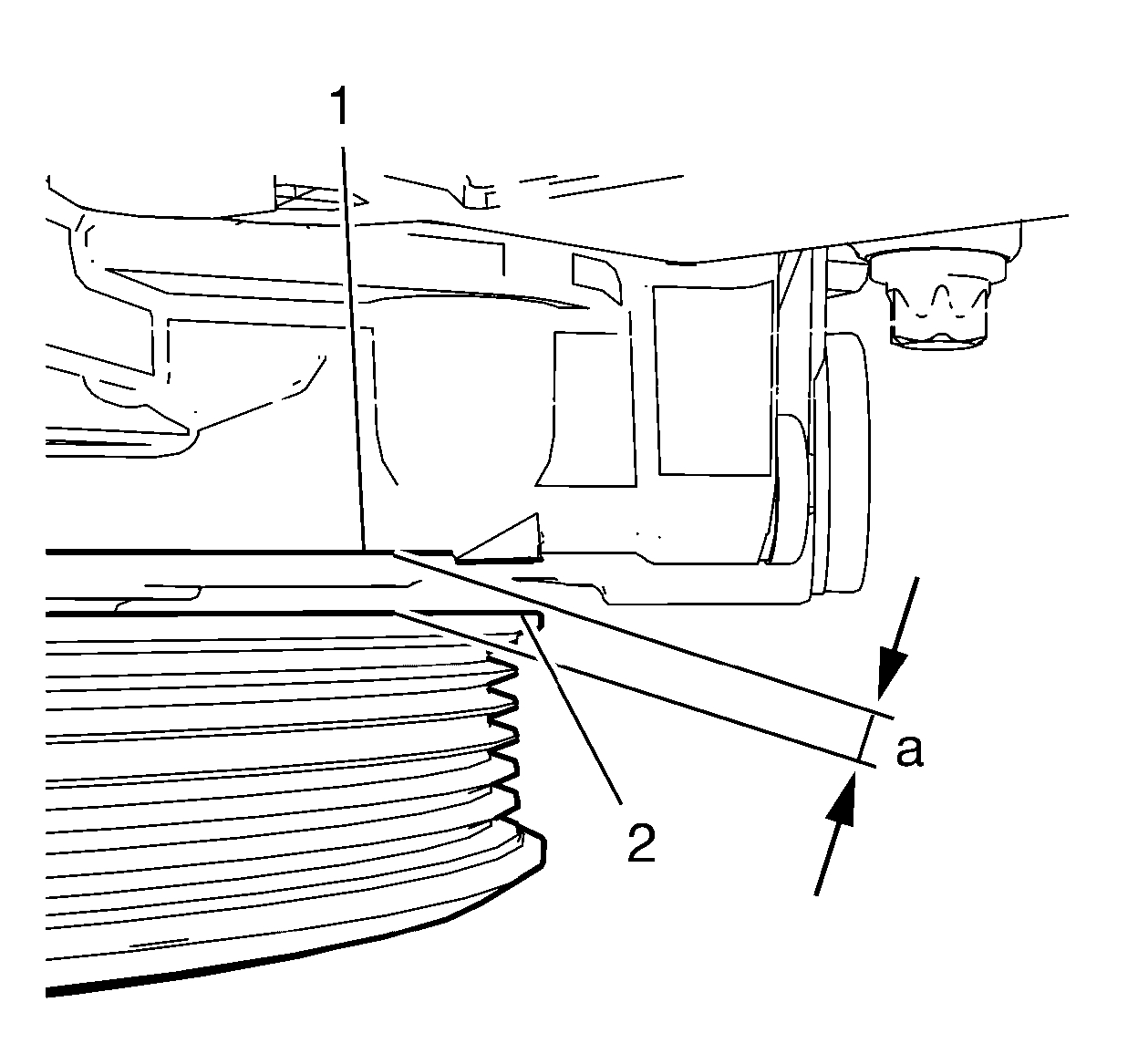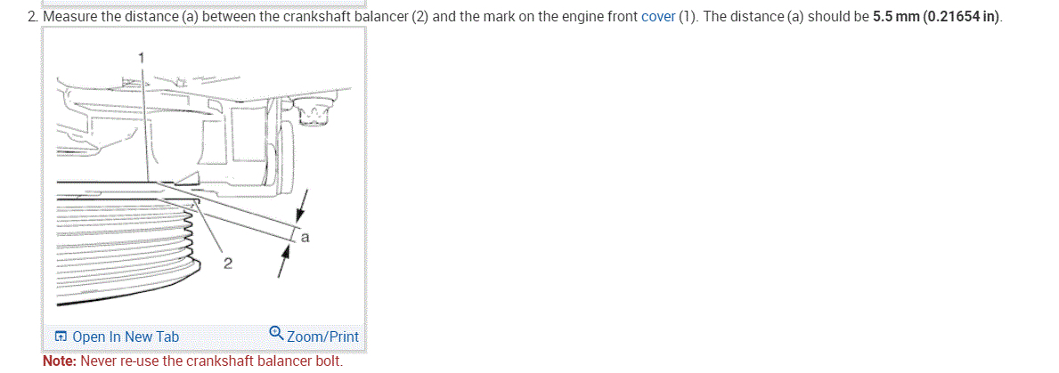 2. Measure the distance (a) between the crankshaft balancer (2) and the mark on the engine front cover (1). The distance (a) should be 5.5 mm (0.21654 in).