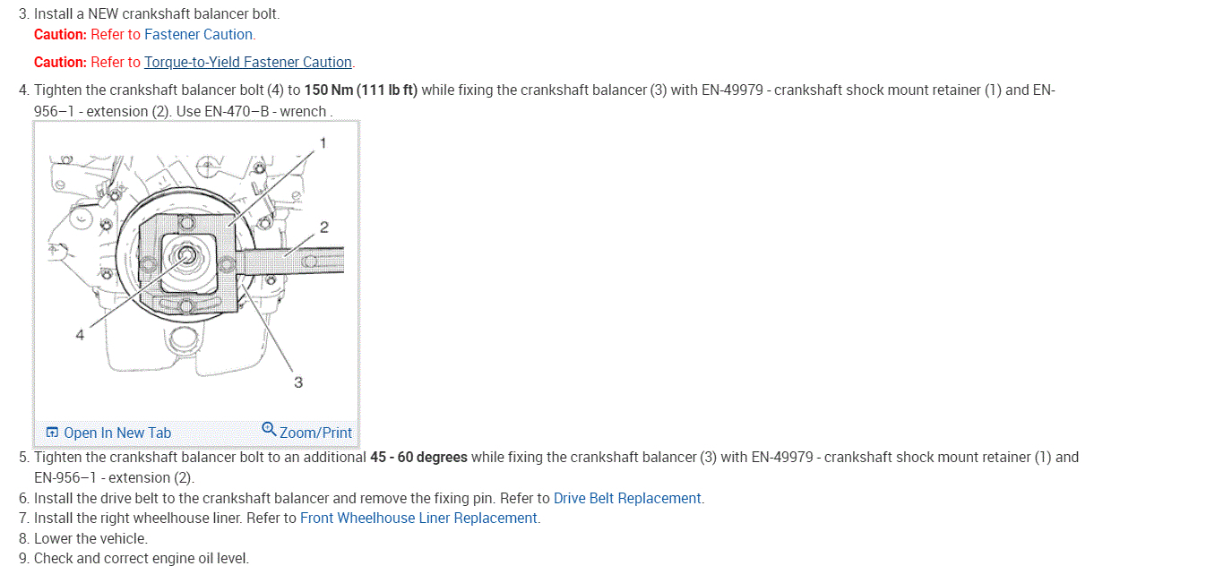 As far as torque, here are the directions for removing and replacing the balancer. It includes torque specs and specific directions. Additionally, it does recommend the replacement of the crankshaft bolt.