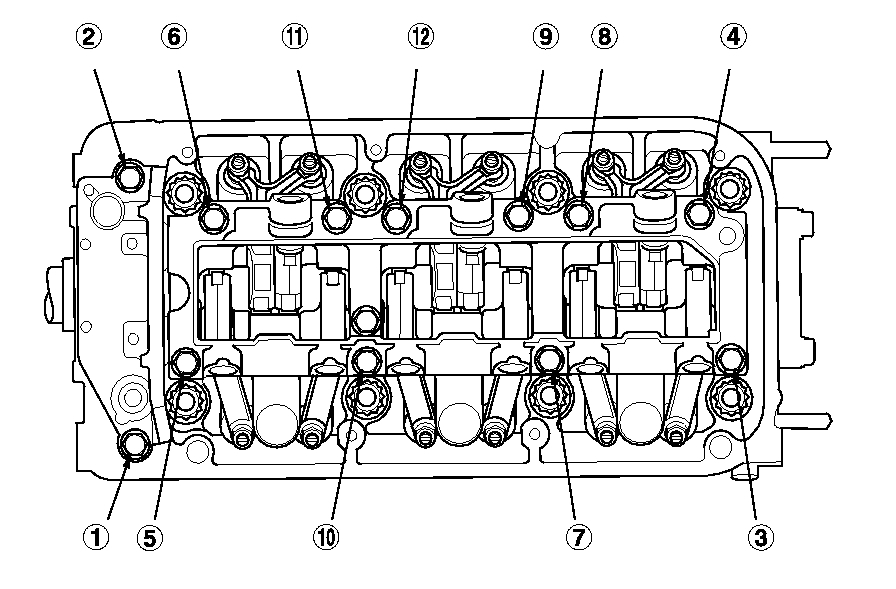 -1 Loosen the rocker shaft bridge mounting bolts and the rocker shaft holder mounting bolts in sequence two turns at a time, to prevent damaging the valves or the rocker arm assembly.