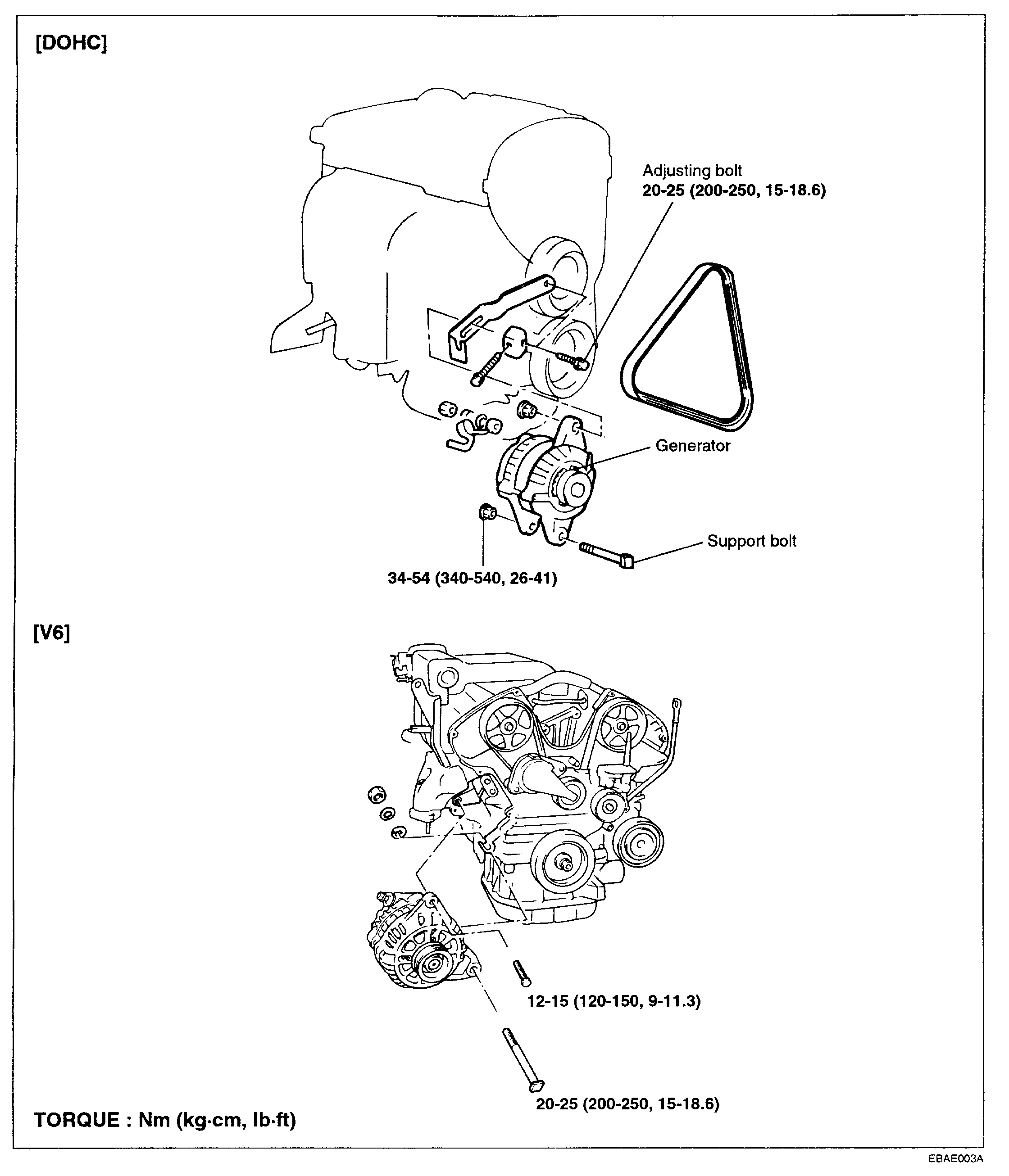 Alternator nut A: 35 - 55 Nm (350 - 550 kg.cm, 25 - 40 ft. lbs.)