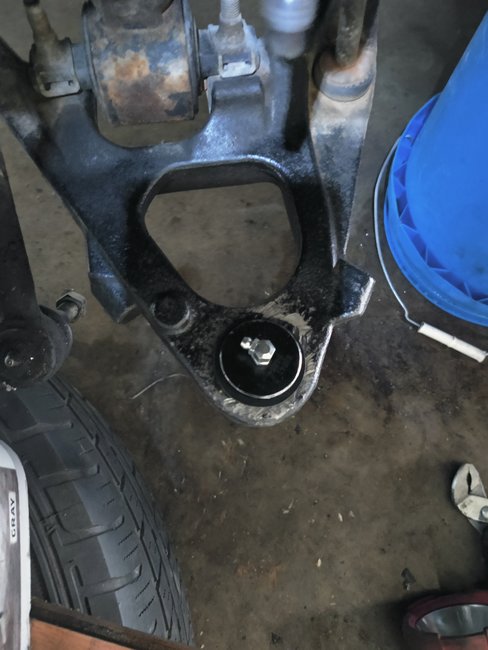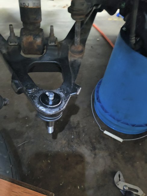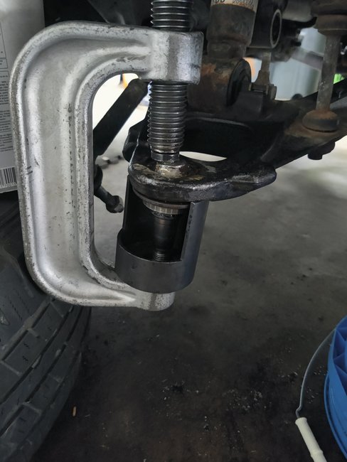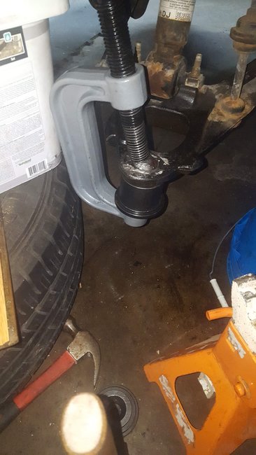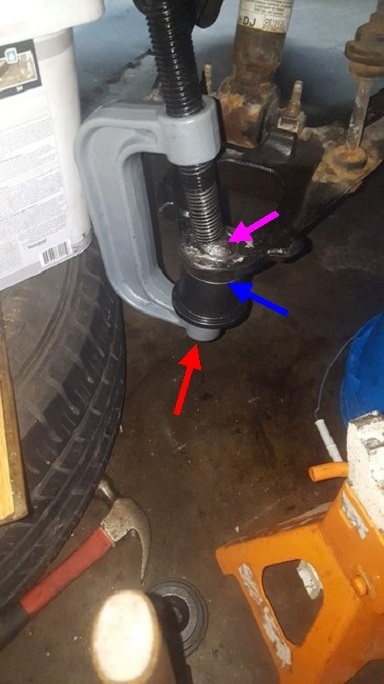 The next thing I've done is the stud didn't line up with the hole on the giant C-clamp, (red arrow). You may see the end of the threads are mashed over. On the car I was working on, the tool setup was different, and the C-clamp and cone were the receiver the stud had to pass into. I realized the problem when I saw the flat plate, (purple arrow), bulging up. That was from pushing the ball into the housing too far. The clues for both problems should have been I was having to tighten the C-clamp way too much. An air impact wrench can be used to make the job go faster, but if you need it to get the old ball joint to move, suspect something's wrong with the tool setup. The best luck I have is to tighten the C-clamp with a box wrench, then give the end of the pressing bolt one good smack with a fairly large hammer. The shock will break the joint loose and get it to start moving. Tighten the wrench, and give it another smack. Doing it that way takes only a little longer, and you'll work up less sweat.